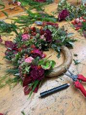 Kursmaterialien: Kranzunterlage, Reif, Band, Draht, frische Floralien, Eukalyptus, Trockenblumen, div. Kleinmaterial, Schmuckbänder