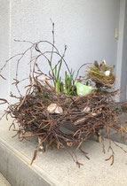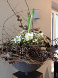 Kursmaterialien: Äste, div. Naturmaterialien, Frühlingspflanzen, Zwiebelblüher, Erde, Moos, Draht, Gefäss, Dekomaterialien