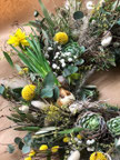 Kursmaterialien: Äste, Draht, Band, Frühlingsblumen, verschiedene Grünmaterialien, Frühlingszwiebel, Bindebast, Verpackungsmaterialien