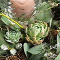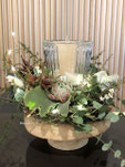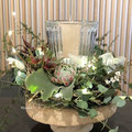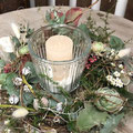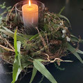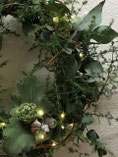 Einzigartig. Wir winden mit Asparagus-Ranken, Eukalyptus und Waldreben einen Kranz. Ausgeschmückt mit Rindenstücke, Zapfen, Zapfenzweigen, Eukalyptusfrüchten und Hauswurz. Mit Glas und Kerze ein Winterschmuck. Wer möchte integriert eine Lichterkette. Als Tisch oder Wandschmuck eine Gestaltung die auch eingetrocknet lange Freude bereitet.